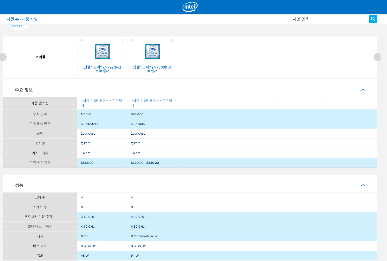 해답은 제조사의 홈페이지에 들어가 데스크탑용과 노트북용에 들어가는 CPU를 비교해