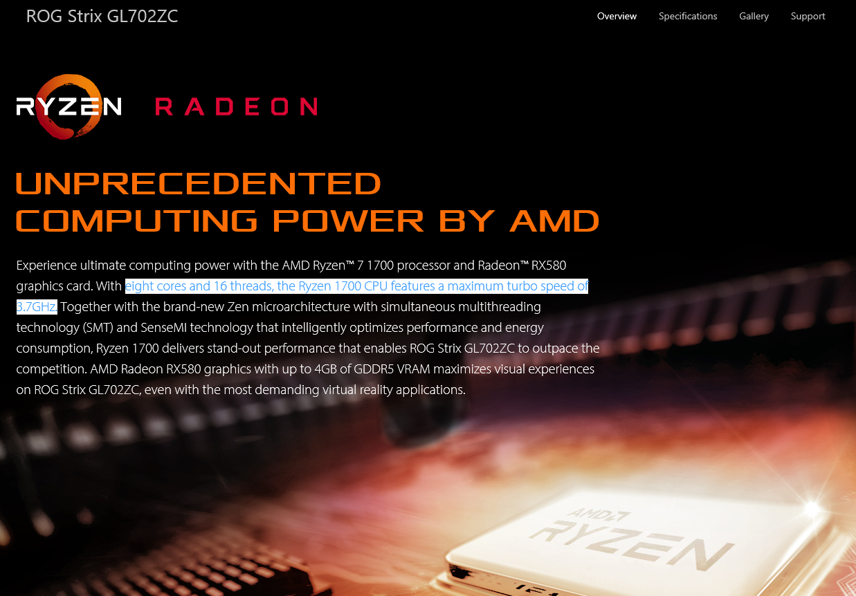 "eight cores and 16 threads, the Ryzen 1700 CPU features a maximum turbo speed of 3.7GHz."